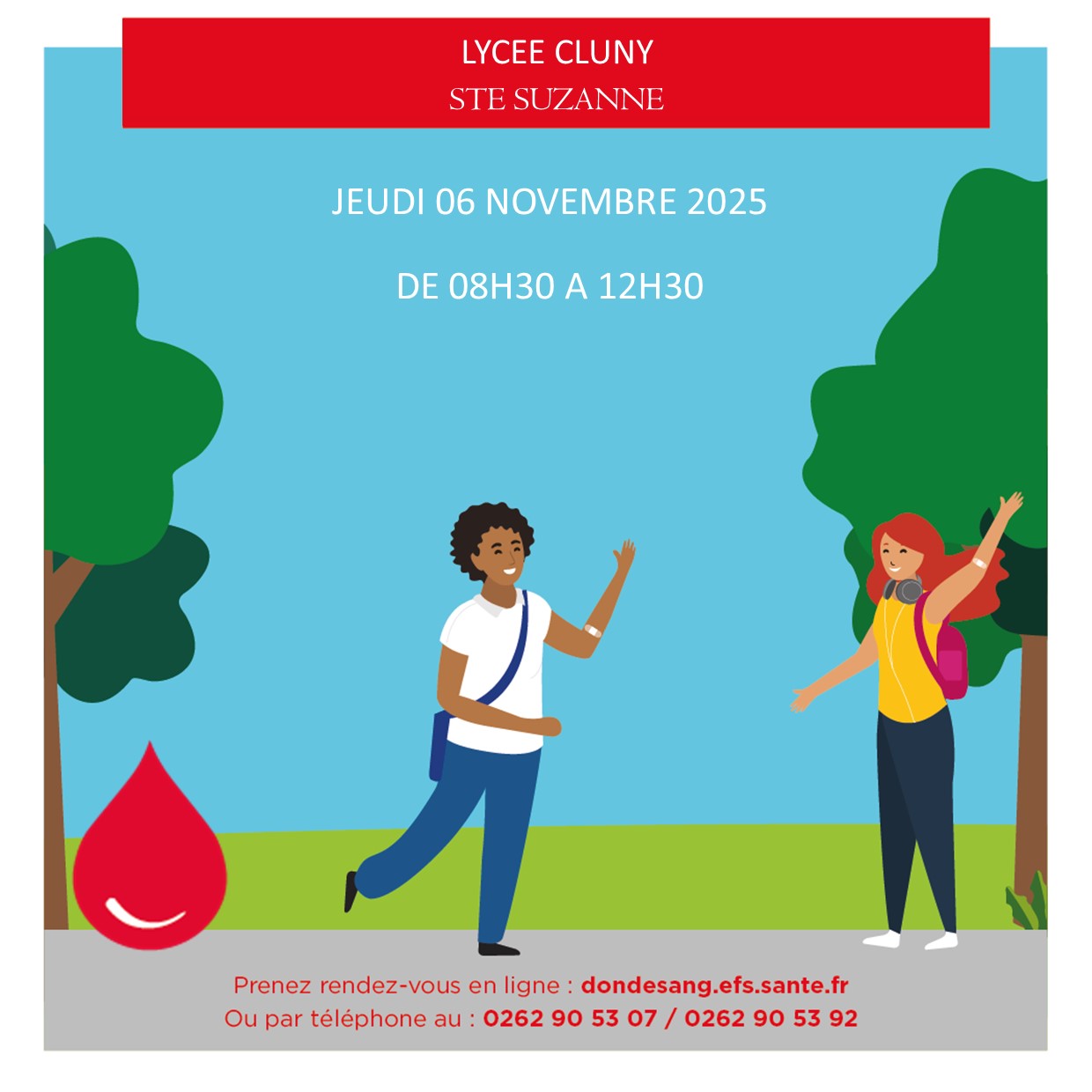 Comme vous le savez, l’EFS viendra réaliser une nouvelle collecte de sang au Lycée Cluny Ste Suzanne en novembre de 8H30 à 12H30.